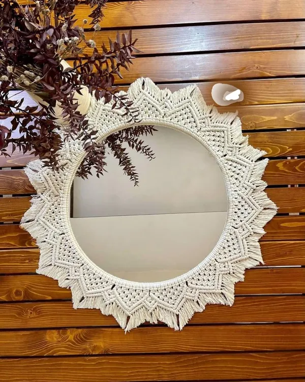 THE TOP KNOTT Home Decor Hanging Wall Mirror with Round Mirror Art Boho Decor Decorative Mirror. Diameter -16/40 cm, Mirror - 12"/30 cm. A perfect size for using and decorating. This modern, elegant hanging wall mirror becomes a gorgeous decoration for your bathroom, bedroom, or any part in your home. It will be looking good on different types of walls. Bring some boho style decoration to your home and it will make a statement in any home with its rustic yet modern flare. Suitable for a housewarming gift or giving this for yourself.