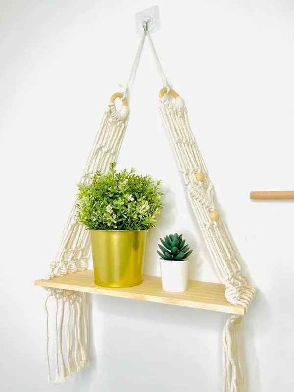 Introducing our handmade wall hanging shelf, perfect for adding a touch of bohemian style to your home decor. This unique wall shelf is made from natural materials, including cotton rope and wooden boards, and features a beautiful design that is both elegant and rustic. The shelf is perfect for displaying plants, books, or other decorative items, and its sturdy construction ensures that it can support even heavier items without bending or breaking. Its minimalist design makes it an ideal addition to any room, whether you're looking to add a touch of boho chic to your living room, bedroom, or home office. Our wall hanging shelf is not only stylish but also functional, as it can help you maximize your space by providing extra storage options without taking up valuable floor space. The floating shelf design allows it to be easily mounted to the wall, and its natural materials blend seamlessly with any decor style. Whether you're a fan of bohemian decor, rustic design, or simply looking for a unique and functional way to display your favorite items, our wall hanging shelf is the perfect addition to your home. Handmade with care and attention to detail, it is sure to become a cherished piece in your collection for years to come.