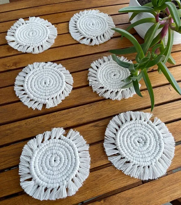 Coasters , Vintage Coaster Set , Drink Coasters Fabric , Cotton Placemat , Floral Coaster , Boho Coasters , Plant Coaster Handmade round coasters. These handmade fringe coasters will add a decorative rustic style to your home. Ideal for if you want a placemat for your steaming cuppa or a landing pad for your favourite pot plant, these coasters are the perfect finishing touch. Makes a great gift for those who love boho home décor or make it a perfect addition to your own home or office space. Upon arrival of your order and after removing your coaster(s) from the packaging we recommend using a clean comb to gently brush through the fringe to spruce up your coaster.